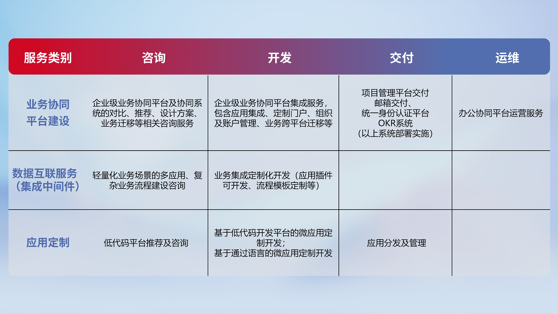 针对钉钉、、、、企微、、IDaas等平台级产品提供产品的规划、、方案、、、交付、、定制化开发等服务,,,实现如统一协同办公、、智能客户服务、、、混合会议管理、、智能数据查询、、、等业务场景,,,,实现数字化转型。。。。
