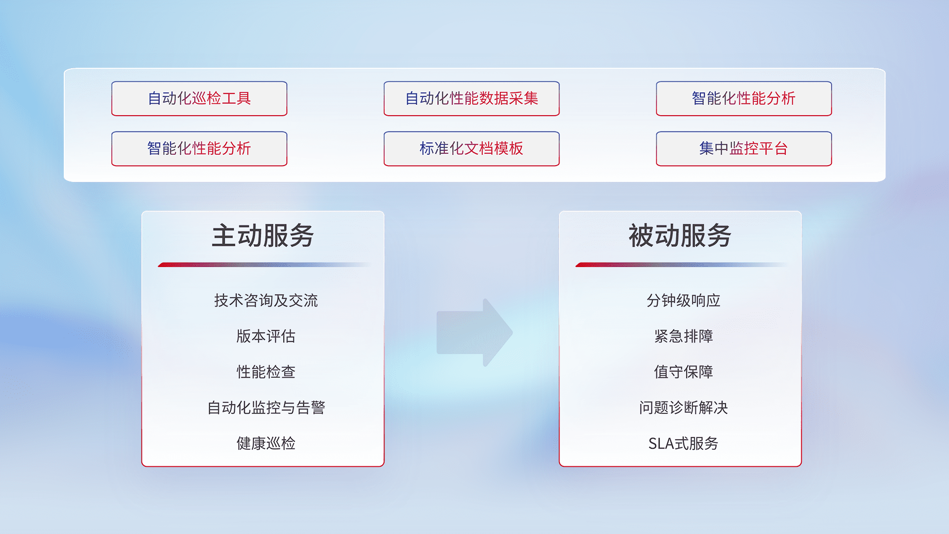 智能化工具和标准化文档,,,保障服务质量,,提供主动服务(包含技术咨询、、、、版本评估、、、、性能检查、、自动化监控与告警、、健康巡检)和被动服务包含(分钟级响应、、、紧急排障、、、值守保障、、、问题诊断解决、、、、SLA服务)。。